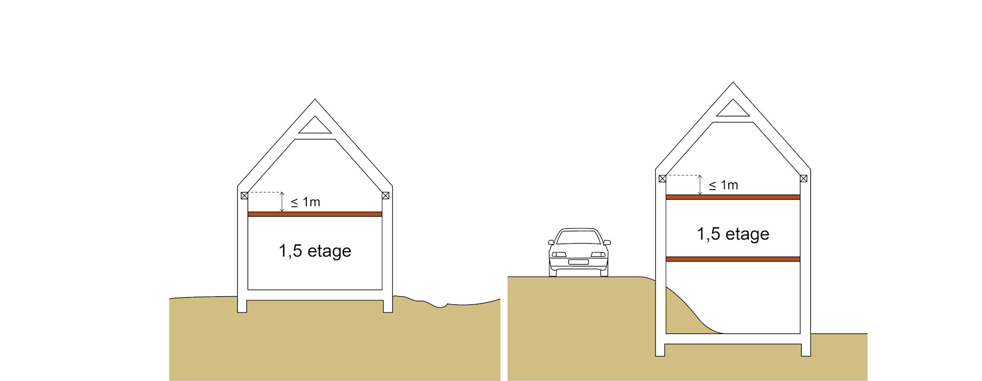 Et hus i 1 ½ etage kan også være med udnyttet kælderetage. Undtagelsesvis kan et 1 ½ etages hus have en kælder, hvor noget af loftet ligger højere end 1,25 meter over terrænniveau, hvis huset er placeret på et skrånende terræn. Dog må huset ikke fremtræde som 2 etager fra vej eller fra naboer. Grænserne for sokkelhøjde ved laveste sokkel skal overholdes som beskrevet i lokalplanen.