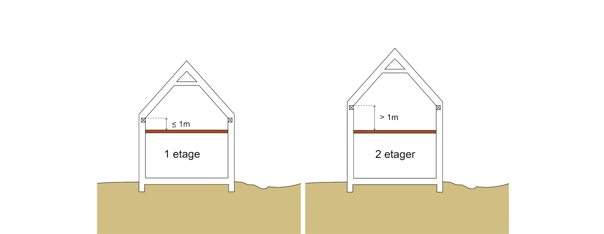 Ved opgørelse af etageantallet tæller en tagetage med trempelhøjde på mere end 1 meter som en hel etage. Trempelhøjden måles som afstanden fra gulvoverfladen til overkant af den bærende tagrem. Ved ensidig taghældning måles trempelhøjden i den lave side. Kipkoten skal overholdes i den høje side.