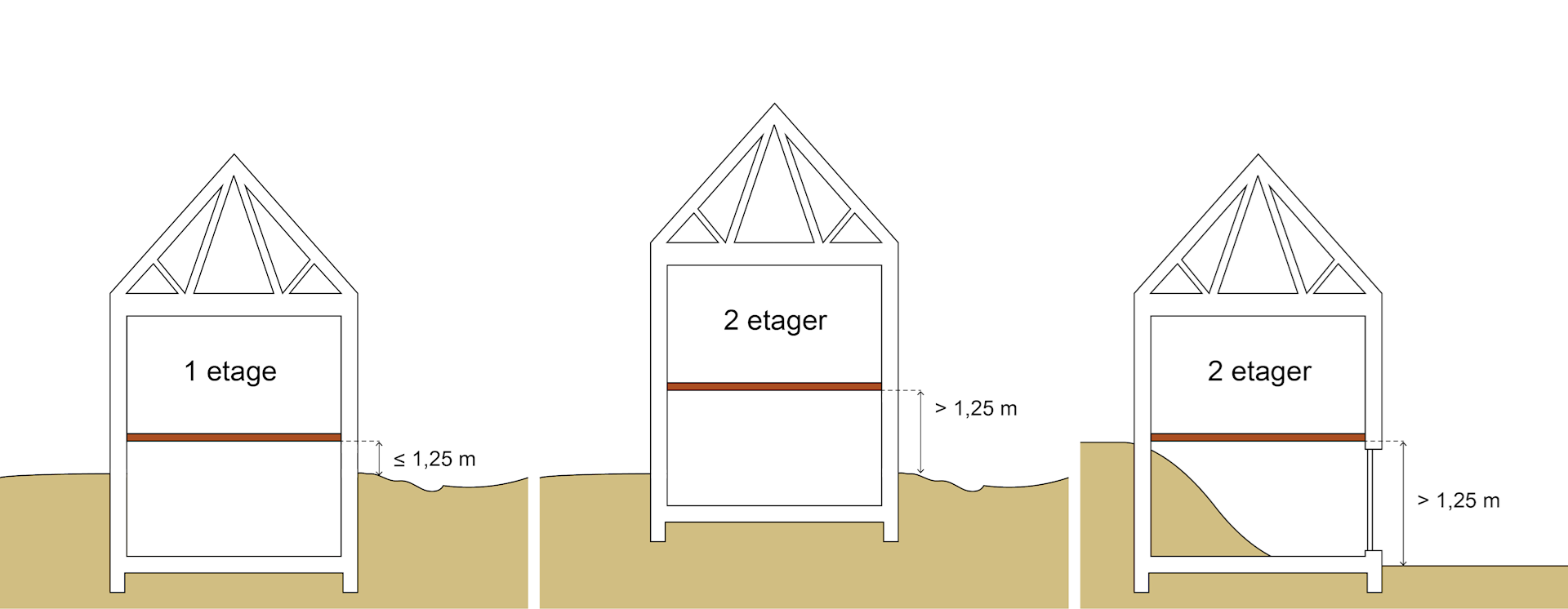 Hvis loftet i en udnyttet kælder er 1,25 meter eller mere over terrænniveau, regnes kælderen som en hel etage. Hvis loftet er mindre end 1,25 meter over terrænniveau, regnes kælderen ikke som en etage.