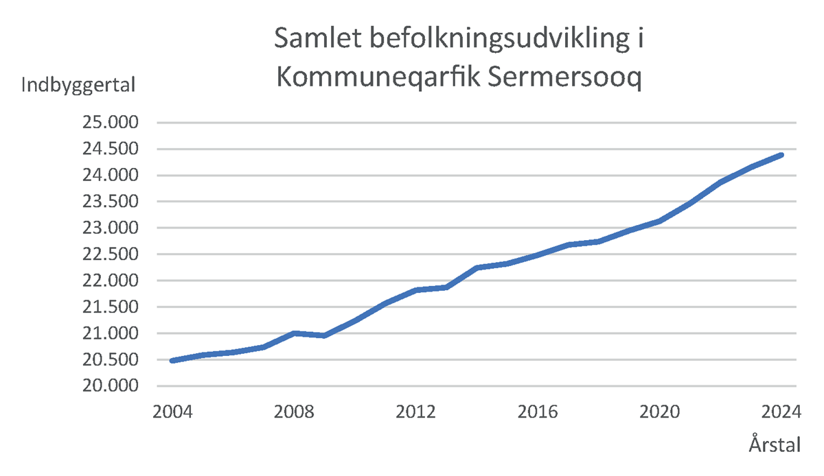 I perioden 2018-2024 er Sermersooqs andel af landets samlede befolkning steget fra 40,5% (2018) til 43% (2024). Det er særligt i Nuuk, der opleves en kraftig befolkningstilvækst, der i perioden er steget med 11,6%. Både i Tasiilaq og Paamiut geografierne er der i perioden oplevet fraflytning. Befolkningstallet for kommunen under ét er vokset med knap 8%. Landsgennemsnittet i perioden er en stigning på 3%.